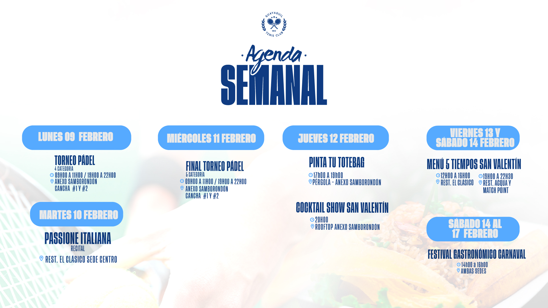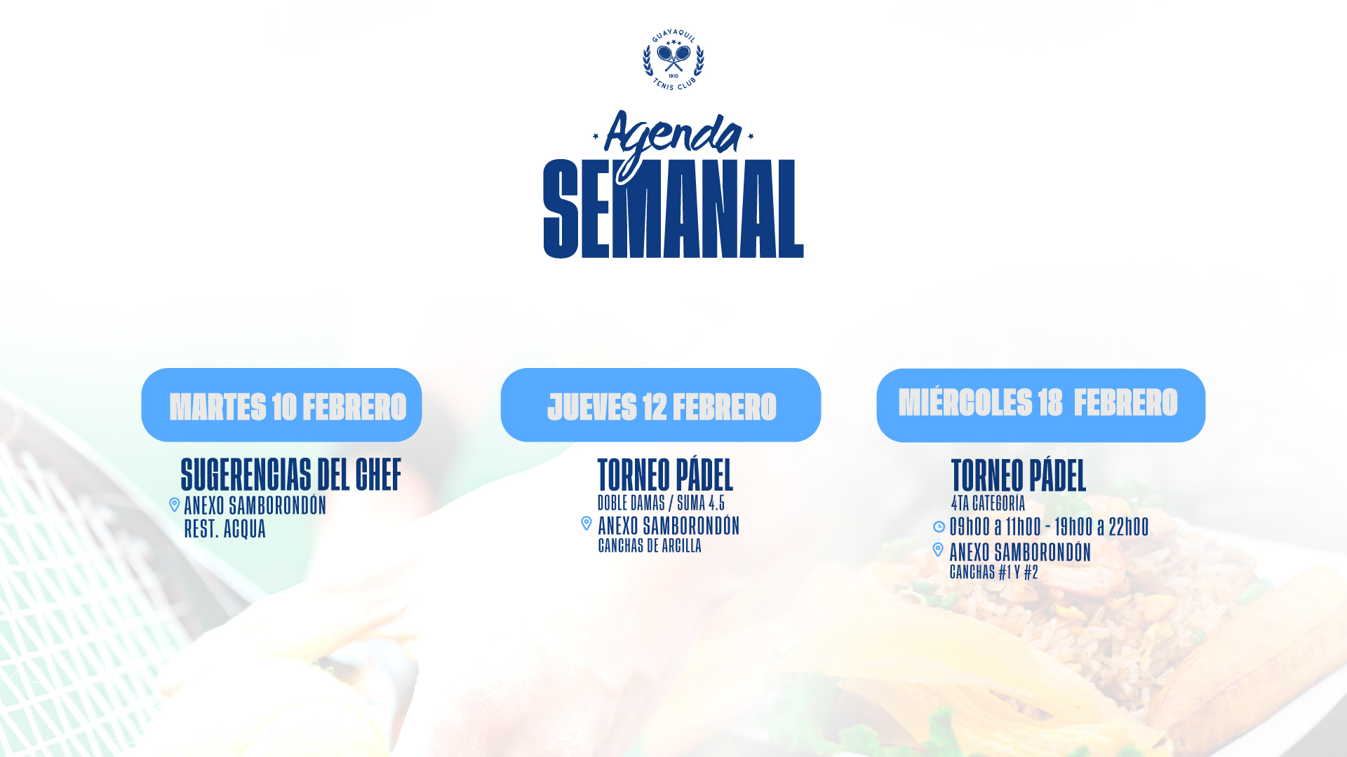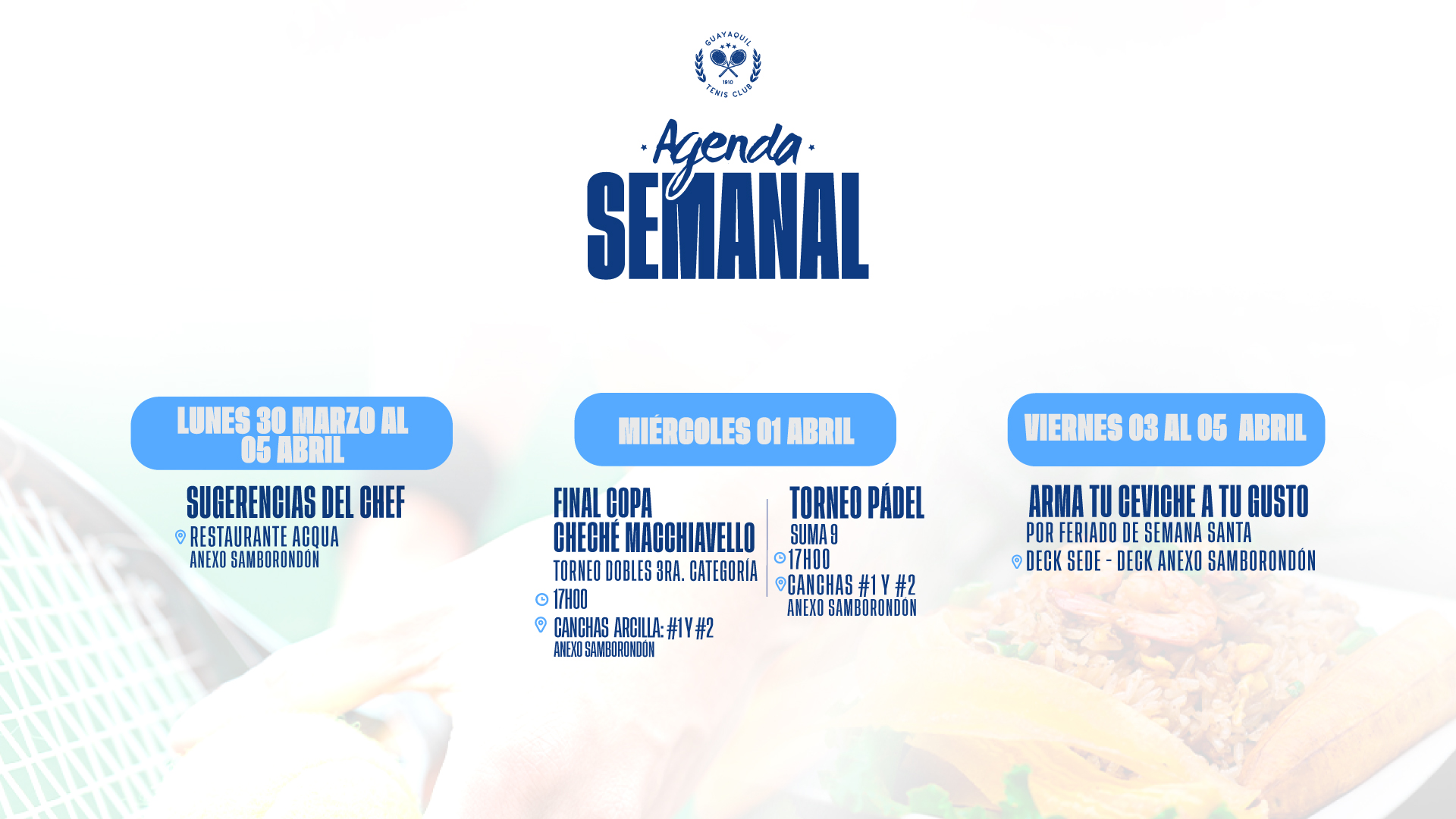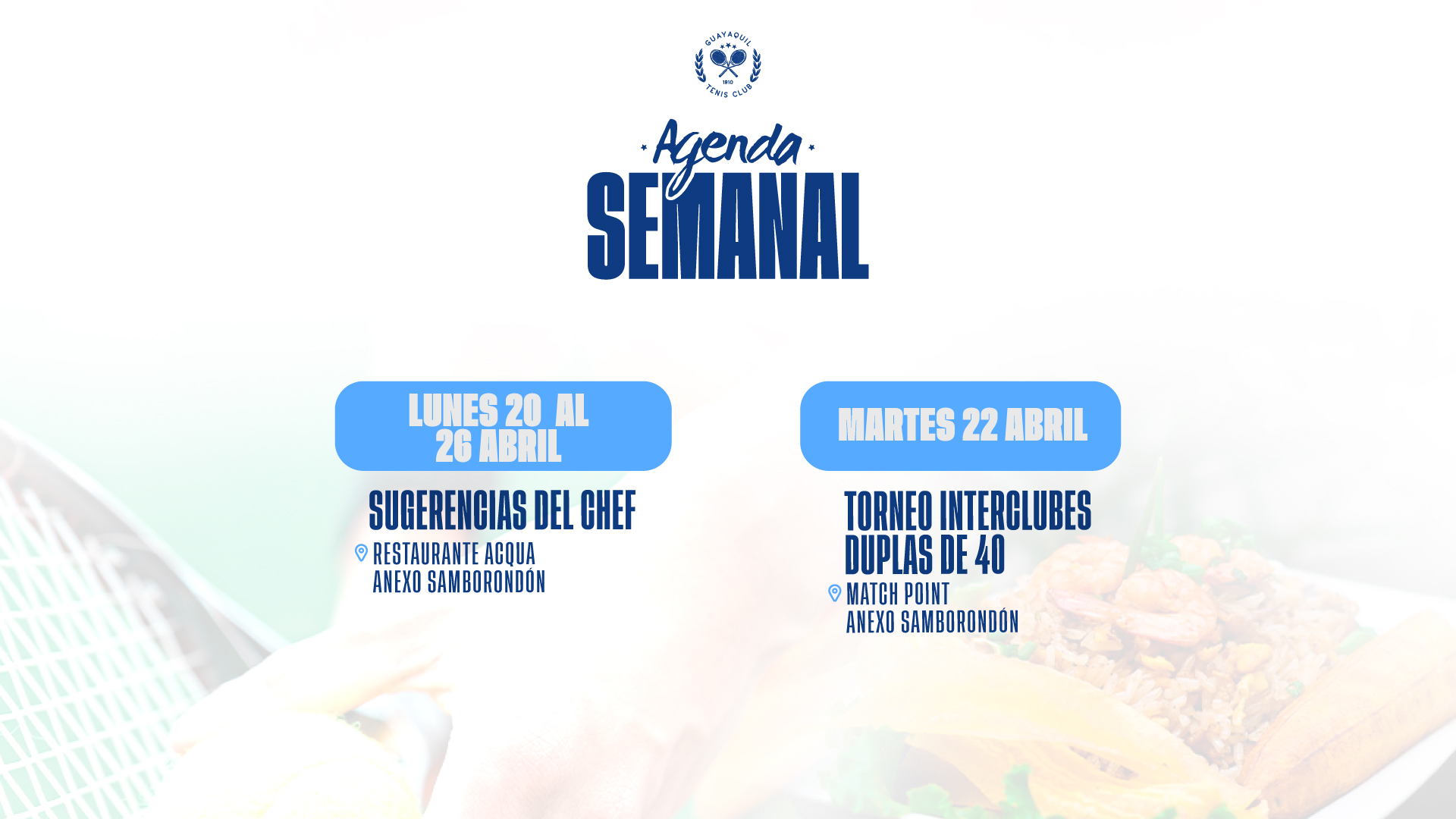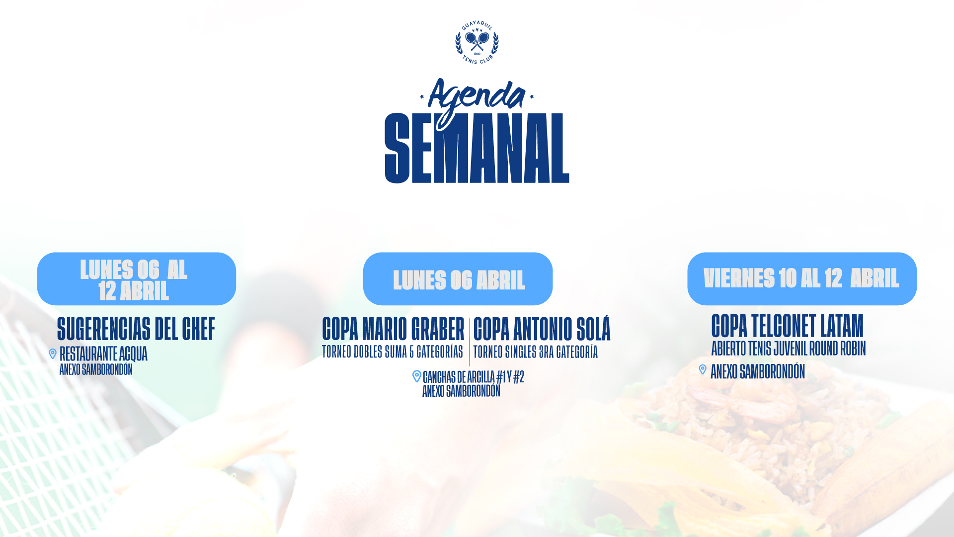 GUAYAQUIL TENIS CLUB se reserva el derecho de actualizar los presentes Términos y Condiciones siempre que lo considere necesario y oportuno. En consecuencia, recomendamos al usuario revisar periódicamente las modificaciones efectuadas al acuerdo.