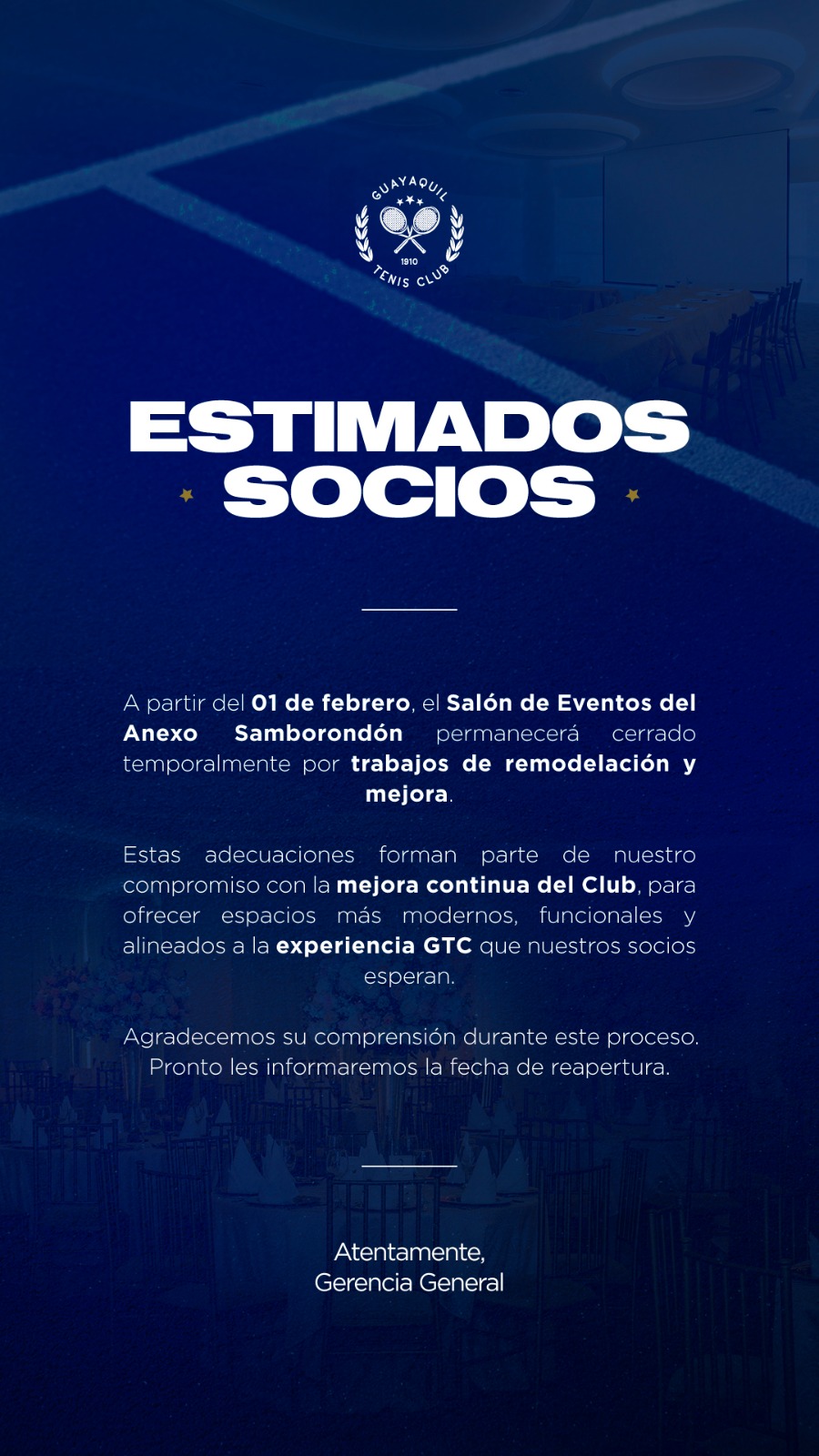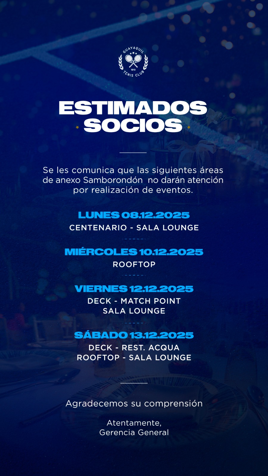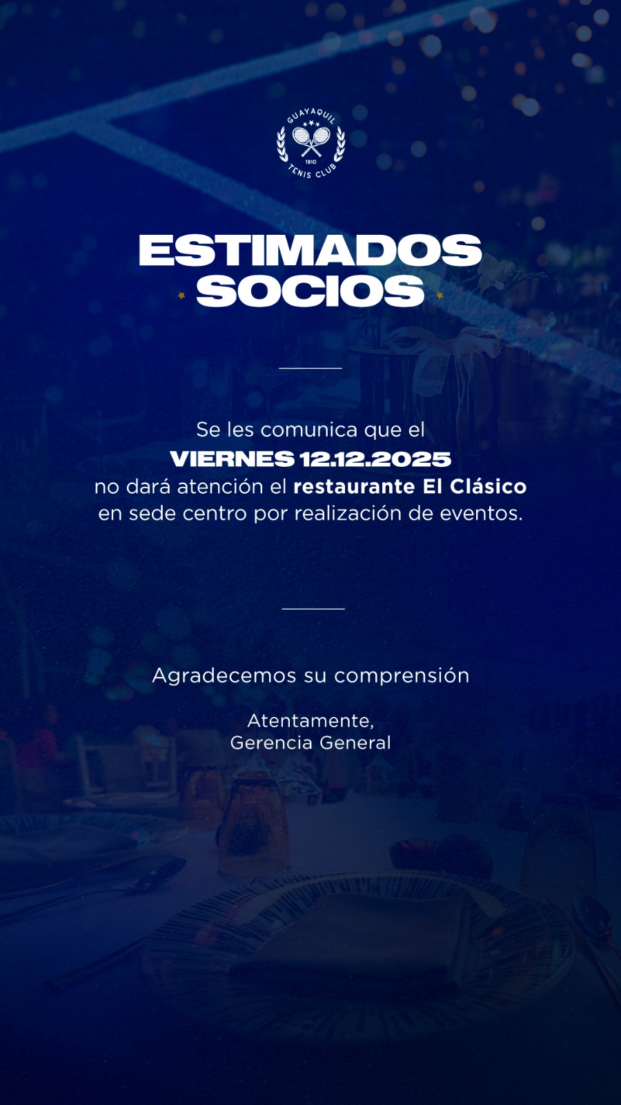 GUAYAQUIL TENIS CLUB se reserva el derecho de actualizar los presentes Términos y Condiciones siempre que lo considere necesario y oportuno. En consecuencia, recomendamos al usuario revisar periódicamente las modificaciones efectuadas al acuerdo.