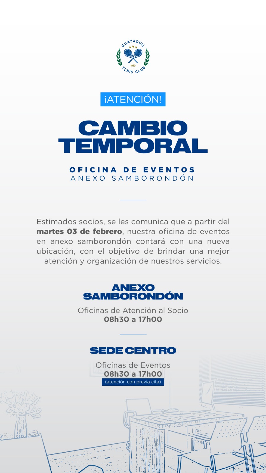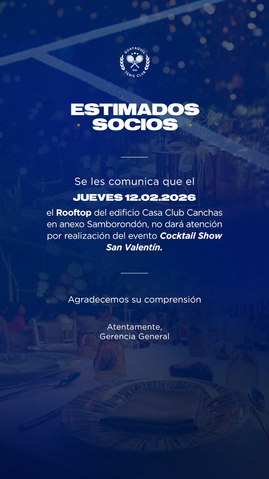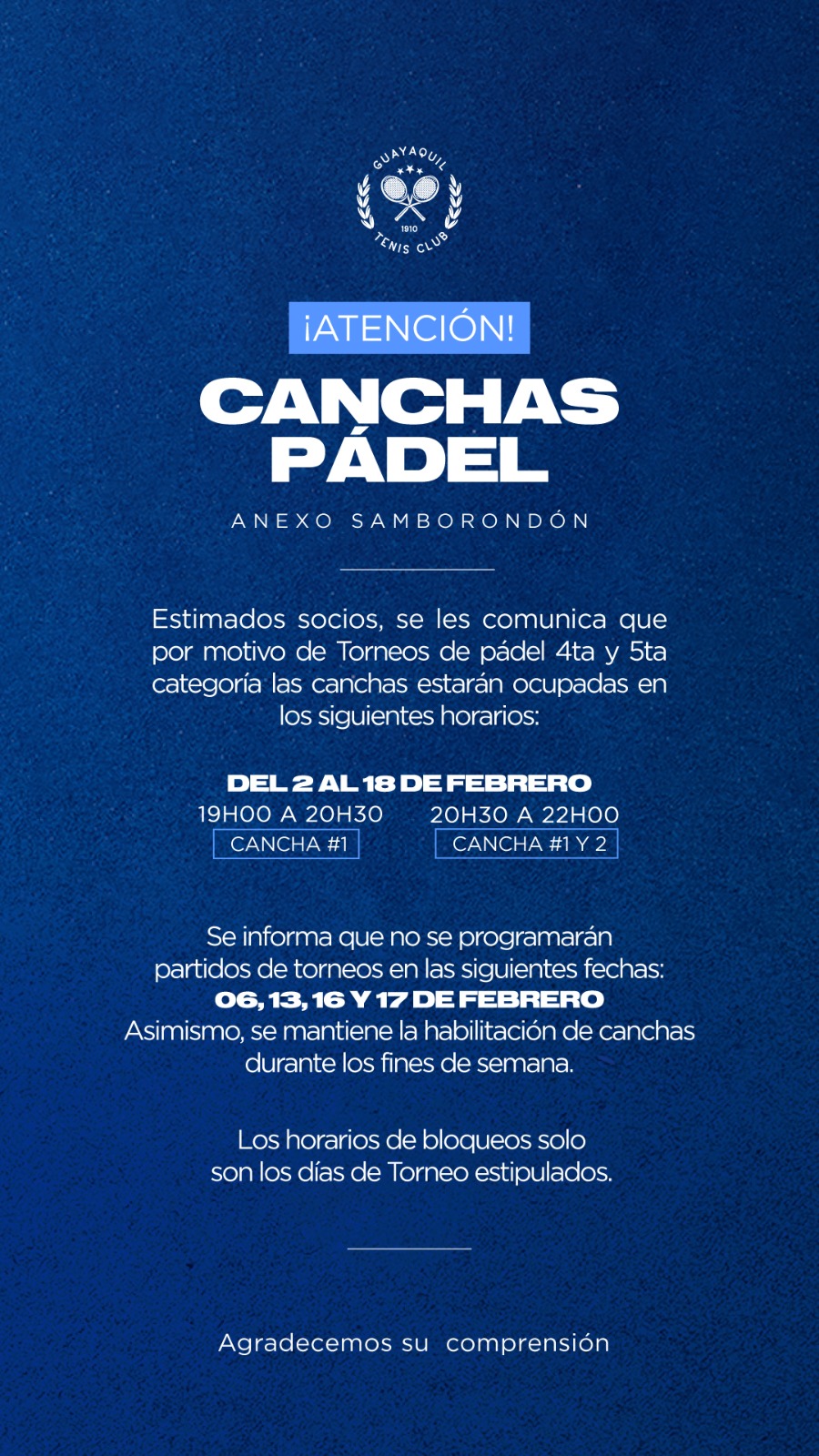 GUAYAQUIL TENIS CLUB se reserva el derecho de actualizar los presentes Términos y Condiciones siempre que lo considere necesario y oportuno. En consecuencia, recomendamos al usuario revisar periódicamente las modificaciones efectuadas al acuerdo.